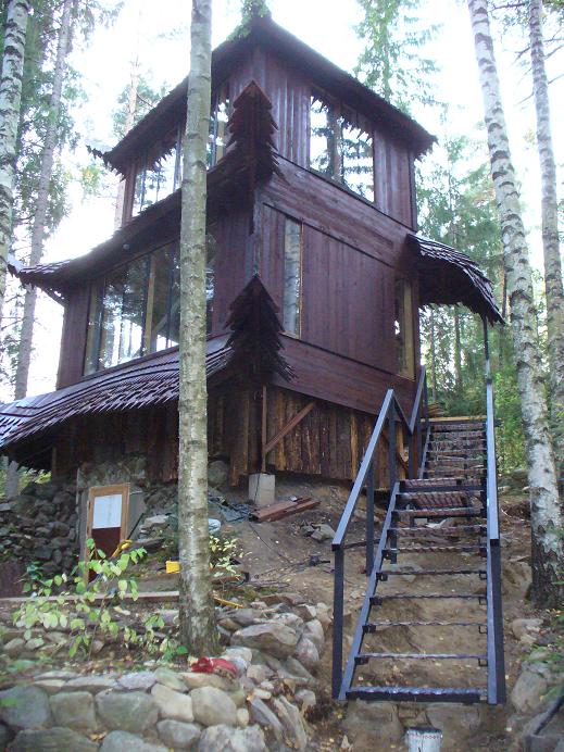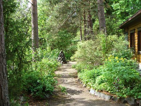 Puolen hehtaarin tontti, joka on muutettu metsästä puutarhaksi 25 vuoden aikana vähitellen pääasiassa kottikärryn, rautakangen ja lapion avulla. Kivien välistä paikkansa ovat löytäneet mm. maksaruohot, kärhöt ja ruusut. Puutarhassa on myös tekolampi ja eksoottinen huvimaja.
